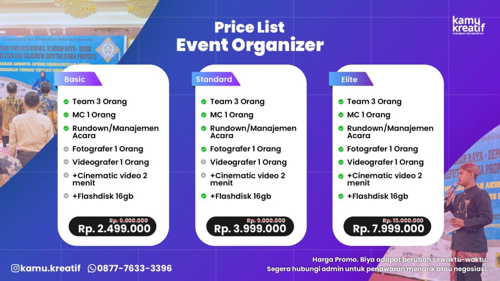 Mau buat event yang meriah? Jadikan event kamu lebih berwarna dengan layanan MC, Photo Documentation, Video Documentation, dll.